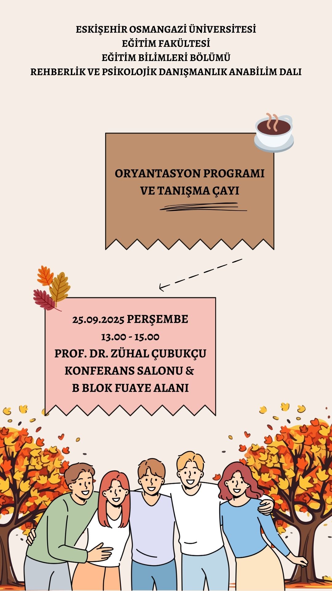 1. Sınıf Rehberlik ve Psikolojik Danışmanlık programı öğrencilerinin, bölümü, öğretim elemanlarını, üniversiteyi, arkadaşlarını ve şehri tanıyabilmeleri amacıyla düzenlenecek olan programa katılımları önemle duyurulur.